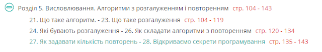 обираємо Розділ 5. Висловлювання. Алгоритми з розгалуженням і повторенням стр. 104-143, натиснувши зображення "+", розташованого ліворуч від назви розділу.